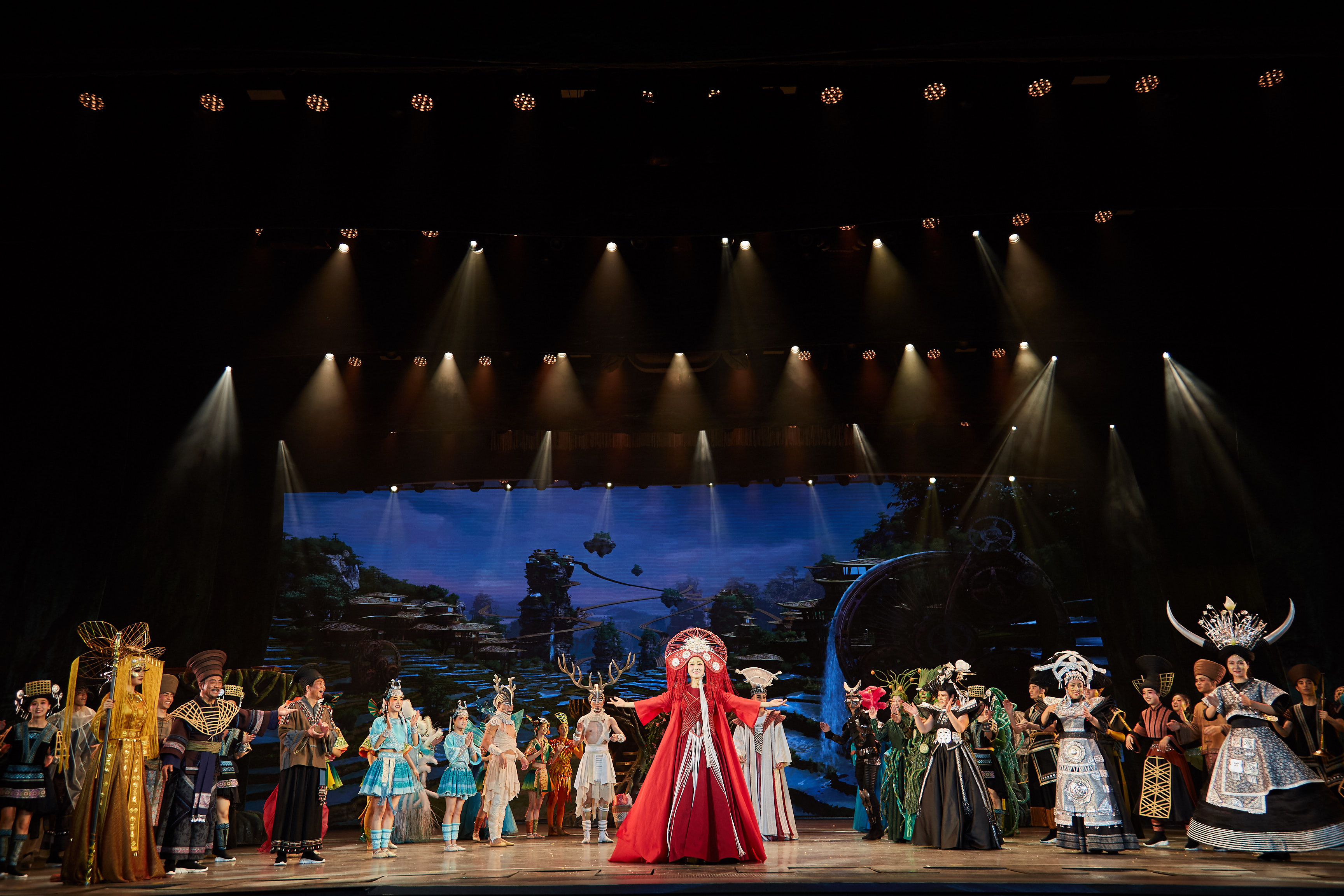 身著婚禮盛裝的青年鹿與“橋“在村民的簇?fù)硐鲁霈F(xiàn)在舞臺上,村民、觀眾與萬物生靈齊聚舞臺,村長宣布婚禮開始,二位新人一敬天地、二敬父母、三敬觀眾,婚禮禮成,新人為受邀的觀眾斟上傳統(tǒng)的高山流水酒,在喜慶熱鬧的《干一杯》音樂中,眾人舉杯,村民、生靈與觀眾們開始了狂歡。